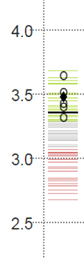 You should be most concerned with the placement of your marker (♦). A score in the red section of the column indicates that your institution ranked in the bottom 30 percent of all institutions. A mark in the green section indicates your faculty rated a benchmark in the top 30 percent of all institutions. A mark in the grey area indicates a "middle-of-the-road" result.