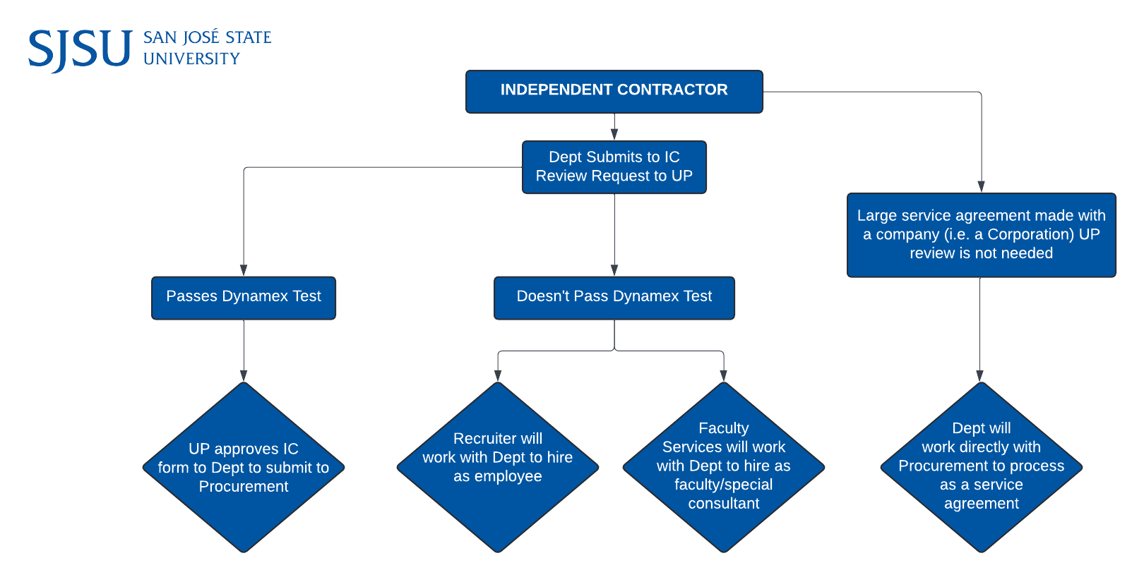 The "Independent Contractor" process refers to the engagement for work at SJSU of an individual or business entity exhibiting specific characteristics, such as (among others):